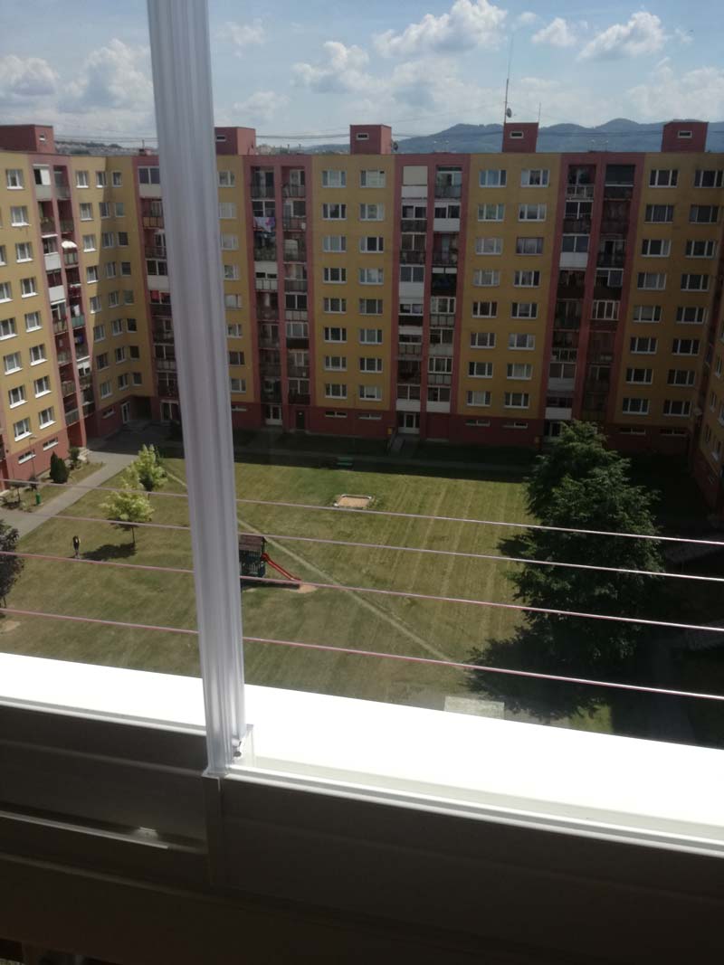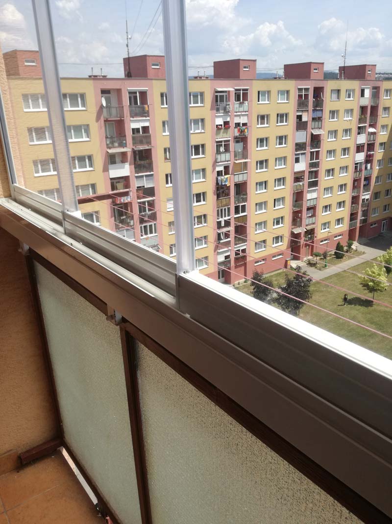 Zameranie zasklení prebieha zo závesných lávok až po montáži nových zábradlí. Montáž zasklení cez byty.